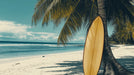 This mural wallpaper evokes an idyllic tropical setting, highlighting lush palm trees and a fine sandy beach bathed in light. The colorful surfboard, leaning against a palm tree, adds a sporty and relaxed touch to the whole. The horizon stretches infinitely, creating a sense of escape to sunny destinations.