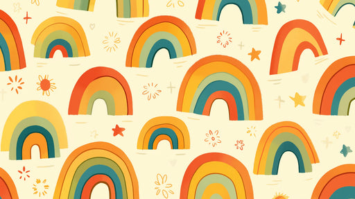 Create a joyful and sunny atmosphere with this charming rainbow wallpaper. Depicting repeating rows of colorful rainbows, smiling suns, and cozy cl...