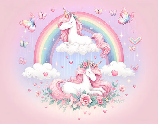 Transform your space into a magical wonderland with this Unicorn Mural Wallpaper. Featuring a vibrant rainbow and a majestic unicorn duo peacefully...