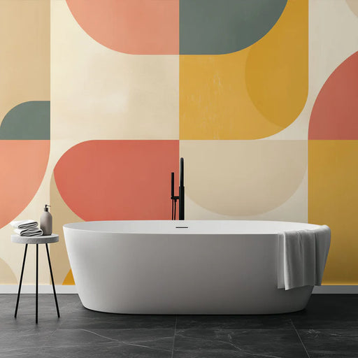 This mural wallpaper features a retro geometric design with rounded shapes and soft, warm colors. The blocks of peach, mustard, beige, and blue-gra...