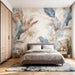 The Ethereal Foliage wallpaper features a delicate illustration of tropical leaves, blending in soothing shades of blue, beige, and gray. The fine details and subtle shading give a sense of depth and lightness, creating a soft and serene atmosphere.